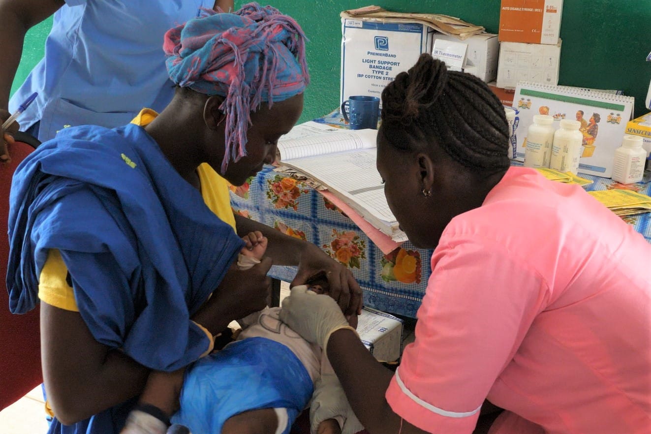 It’s a special service day in Gbondapi town, Sierra Leone, and that means the long wooden benches in the foyer of the health center are filled exclusively with mothers and their young children. More people have turned out than there are seats, so a few perch instead on the concrete ledge surrounding the clinic. Every few minutes, a street vendor stops by to hawk his or her wares with the captive audience, who nurse crying children, hold sleeping ones, wrangle squirming ones, and wait for their turn to see the health team.