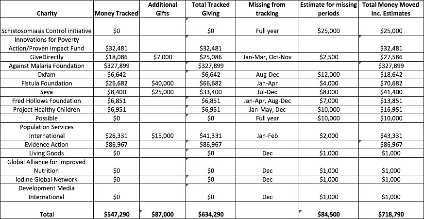 Our conservative estimate is that we moved around $720,000 to our recommended charities in 2014. Our charities can directly track approximately $634,000 of that total through our ongoing web donation tracking ($547,000) or large specific gifts that could be attributed to The Life You Can Save ($87,000). We conservatively estimate that we moved about an additional total of around $85,000 to charities that we are currently unable to track.