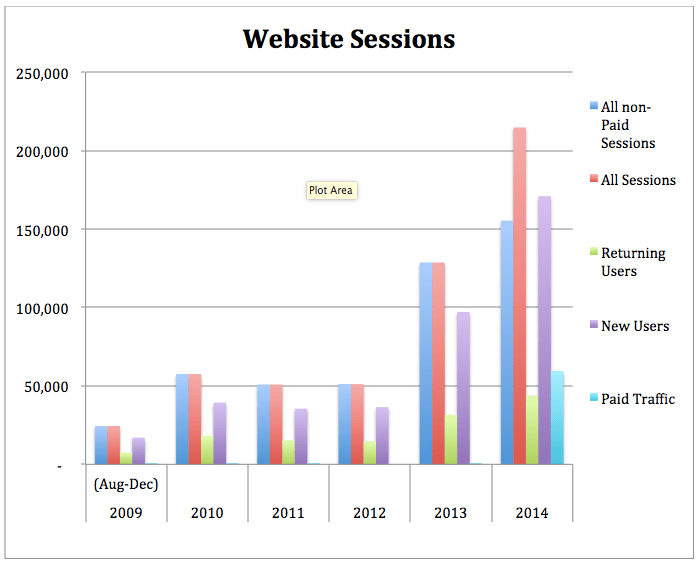In 2014, our website had roughly 215,000 sessions (most of them from new users), an increase of 65 percent relative to the previous year. A bit less than half of this increase was driven by our implementation of Google AdWords.