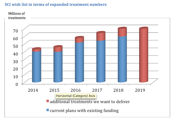 SCI urgently needs to expand our treatment programs. As of 2014, we currently work in 16 countries to treat almost 40 million individuals a year. In order to expand coverage, SCI is looking initially to raise over £2 million, rising annually to £10 million per year thereafter. These funds will help us in our efforts to cost effectively use drug donations from pharmaceutical companies to reach 60 million children every year by 2017—and hopefully more thereafter. To date SCI has not yet used any donated funds to raise more money, but we have now decided that we need to invest more to expand our treatment efforts. The chart below shows that we have promised funding to deliver almost 240 million treatments through 2018 (blue columns).* SCI would like to have funding to deliver 325 million treatments by 2019 (blue plus red columns), an extra 85 million treatments.