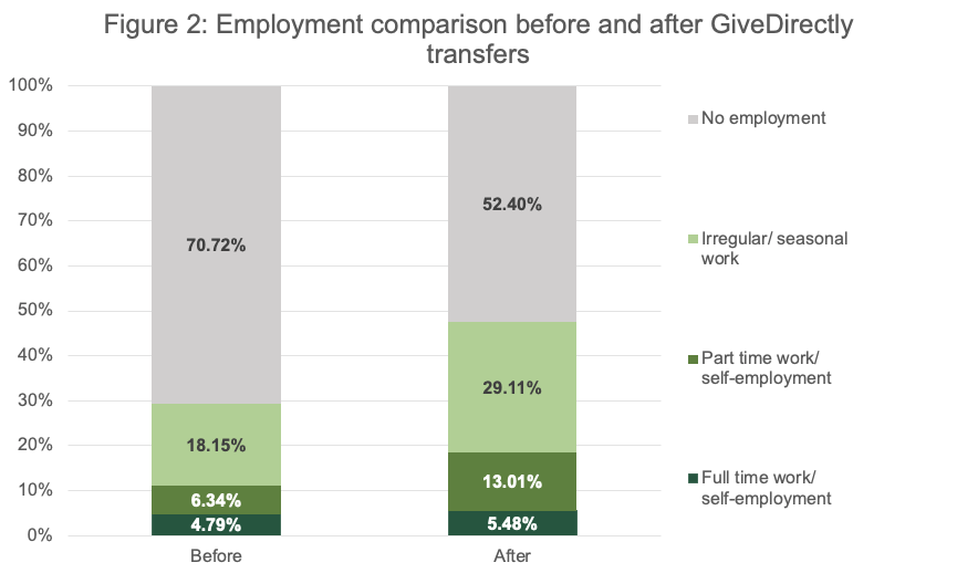 Beyond food assistance, refugees need a boost above the poverty line to truly integrate with their host community and graduate off of assistance. In 2020, we ran a ~$700 lump-sum transfer program in Rwanda’s Mugombwa refugee camp in collaboration with the government and UNHCR. Our evaluation shows signs of success: 80% of recipients paid down predatory debts and 60% used the funds to jump start investments, especially in farming just outside the camp (Figure 1), which provides a plausible path to sustainable self-reliance. Recipients reported higher rates of employment (Figure 2), though we cannot confidently attribute this to the transfers as the evaluation did not include a control group.