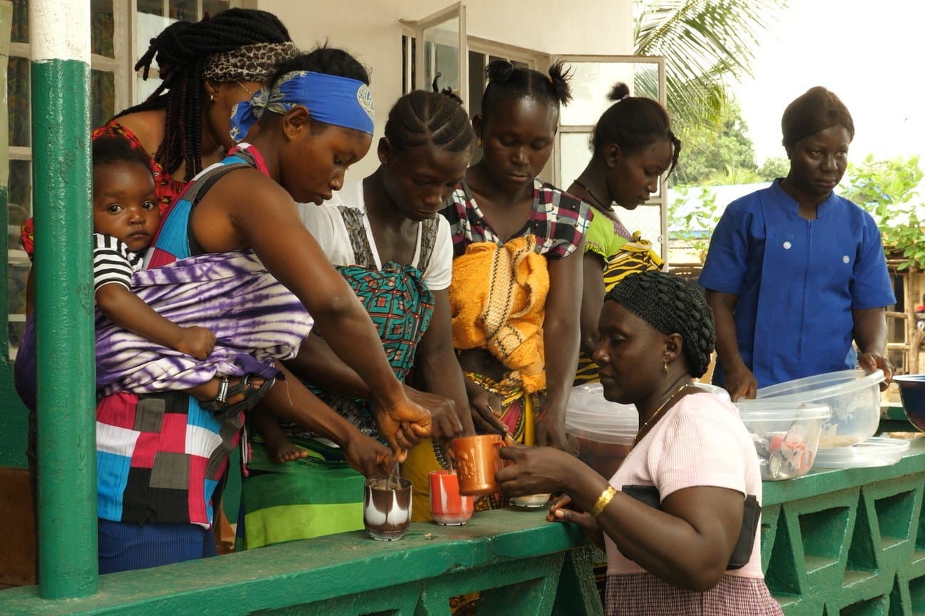 A steaming vat of water boils on a small grill next to the clinic wall, fanned by a woman in a black crocheted beret. She calls the women over in small groups and shows them how to mix a few tablespoons of Pikin Mix roasted flour (made from locally sourced sorghum, sesame, and pigeon peas) into cupfuls of boiling water until it forms a thick porridge. A free, hearty meal for children in families with very little income to buy food, the porridge is a powerful incentive for the women to come to the clinic on a regular basis. The cooking demonstration also gives them the knowledge they need to make the nutritious meal at home.
